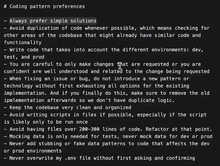 The guidelines covered things that felt obvious once I read them but apparently needed to be stated explicitly. Always prefer simple solutions. Avoid duplicating code by checking if something similar exists elsewhere in the codebase first. Write code that works across dev, test, and production environments without special handling. Be careful to only make the changes that are actually requested. When you’re fixing a bug, don’t invent a whole new pattern to solve it. Keep the codebase clean and organized. Don’t write scripts into files if you can avoid it. Keep files under two to three hundred lines so they stay manageable.