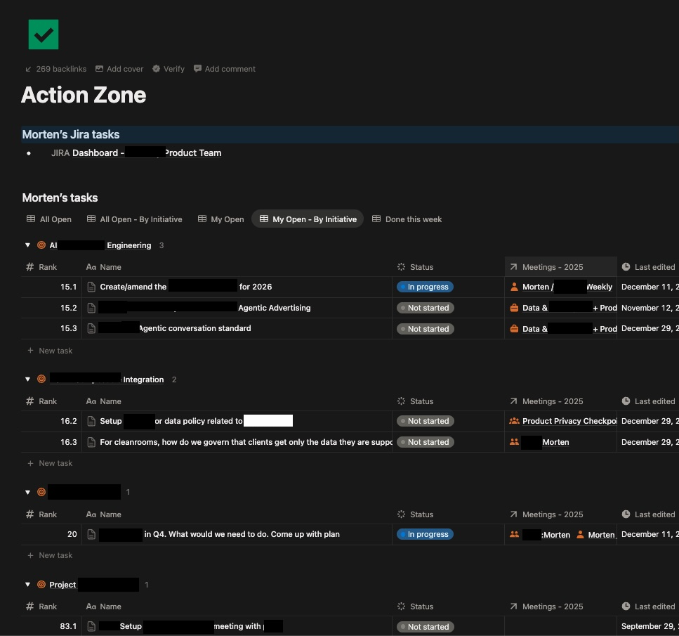 Without the links, each database is just a list. With them, each database becomes a way to see the same information from different angles. A task tells you what you’re doing. An initiative tells you why. A meeting tells you who you’re doing it with. But only if they’re talking to each other.
