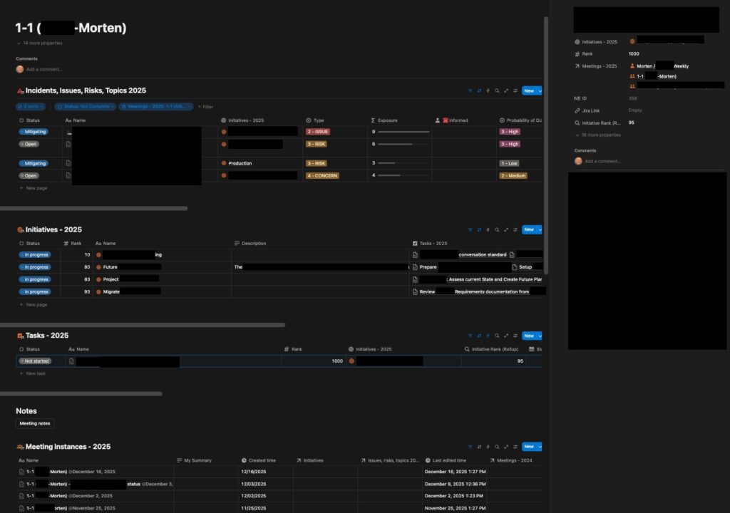 But that’s just the base layer. On top of it, I have databases for meetings, recurring meetings separately, risks, incidents, initiatives, sales opportunities, tasks, contacts, and organizations. Most systems would be a mess at this point. Mine isn’t, because I linked them.